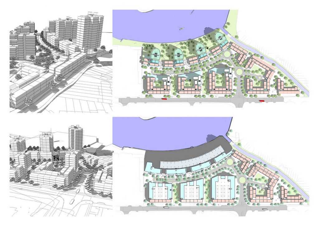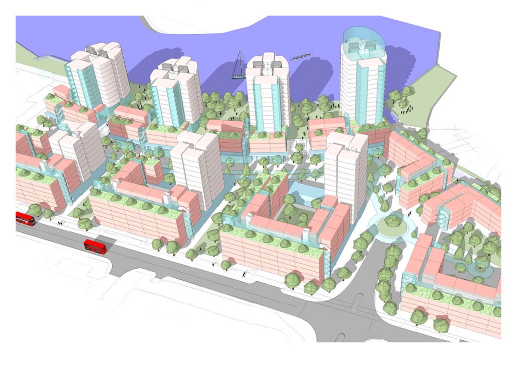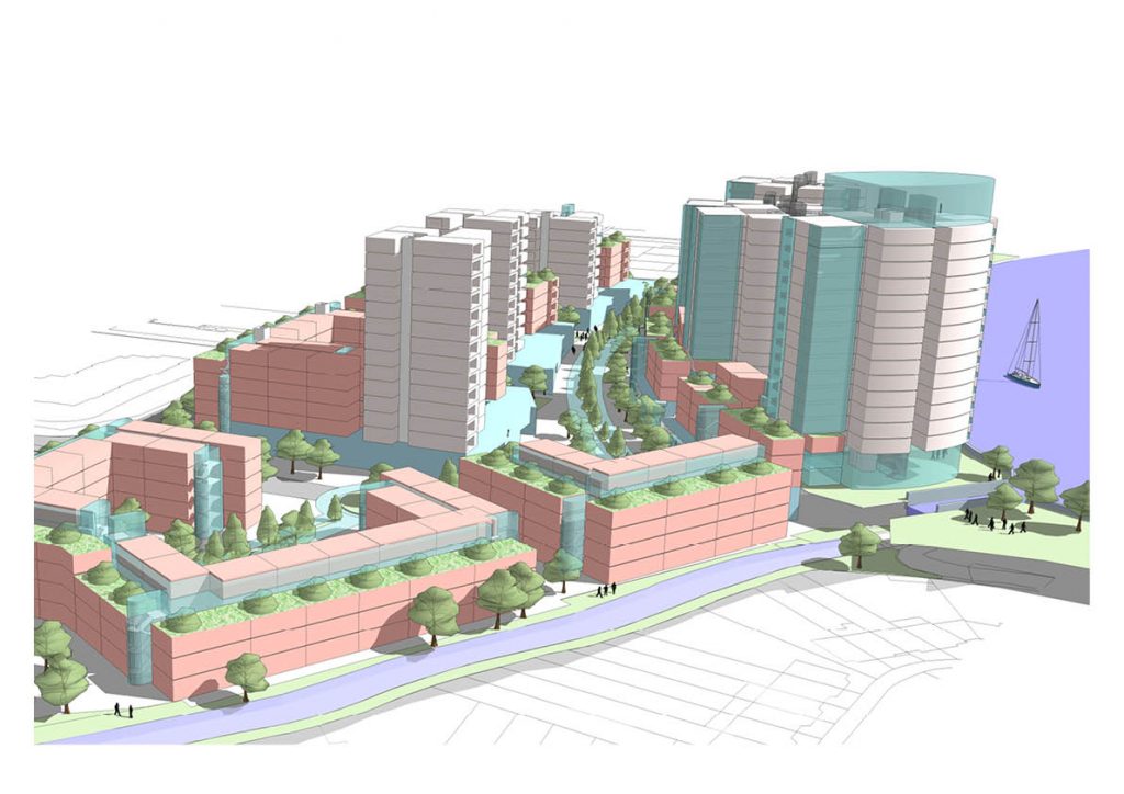 To unlock this area, proposals have been drawn up for a mixed-use development centred around circa 1150 residential units( at a density of 277 units/Ha) arranged in a variety of ‘podium model’ blocks incorporating elevated garden courtyard configurations and tower’s with graduating heights making best use of the river-side location with long views of the reed lands and the River Thames beyond.